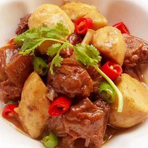 食材:鸭500克、芋仔350克、青椒1根、红椒1根、姜15克、油适量、盐1茶匙、糖1.5茶匙、生抽1汤匙、老抽1茶匙、米酒1汤匙、鸭肉浸膏