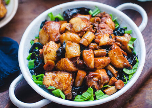 主料:鸡半只、青蒜3棵、木耳1小把、笋干50克、蒜10瓣