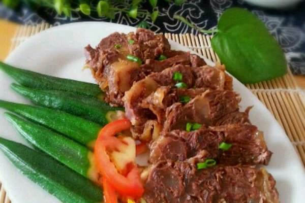 4、牛肉卤熟后凉了切小块用秋葵盘面点缀。